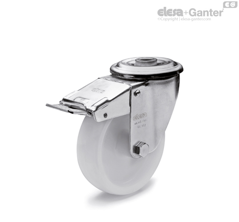 Çark ve braket dönüşünü kilitleyen genel fren. En uygun şekle getirilen boyutlar ve geri çekilebilir pedal, minimal şekilde dolu alanlar ve maksimum harekete geçirme kolaylığını garantiler. Sertleştirilmiş karbon çelik yay.