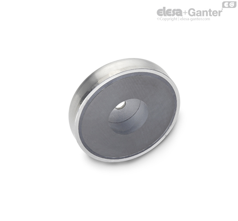 Paslanmaz çelik tespit mıknatısları GN 50.45, mıknatısı koruyan ve kuvvetlendiren ve manyetik akımı manyetik yüzey üzerinde optimal olarak ileten bir paslanmaz çelik muhafazayla ve bir plastik halkayla / yalıtım halkasıyla birlikte bir sistem oluşturur.