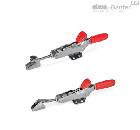 GN 850.2 geçiş kıskaçları, kapatma sırasında yaylı bir emniyet kancası mandalının güvenli bir kilitleme bağlantısı sağladığı bir güvenlik fonksiyonuna sahiptir. Titreşimler veya yanlışlıkla kelepçeyi gevşetme / açma denemesi nedeniyle yanlışlıkla kenetlenmesini önler. Kelepçeyi açmak ve serbest bırakmak için, emniyet kancası mandal mekanizmasını (tek elle işlem) çıkarmak için parmak tutamağını yukarı çekin.