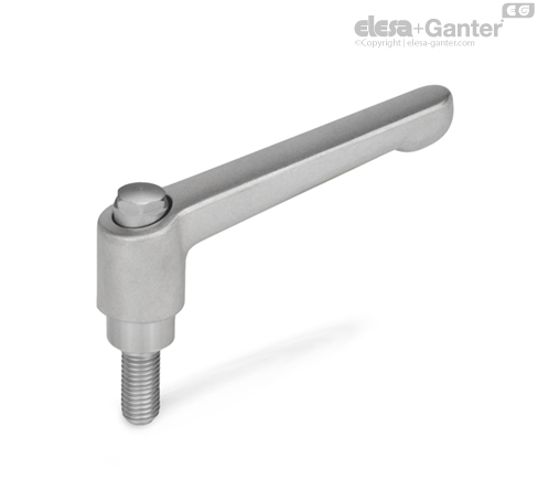Ayarlanabilir el manivelası GN 300.5, dar bir alanda veya belirli bir kaldırma kolu pozisyonunda kenetlenmesi gereken parçalar için en uygunudur. Vidalı takviye, kolayca devreden çıkarılabilen dişli kenarlar yoluyla kola bağlanmıştır.
