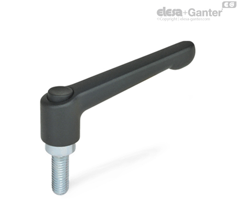 Ayarlanabilir el manivelaları GN 303.2, dar bir alanda veya belirli bir kaldırma kolu pozisyonunda sıkıştırılması gereken parçalar için idealdir. Merkezdeki ek, kolayca devreden çıkarılabilen dişli kenarlar yoluyla manivelaya bağlanmıştır.