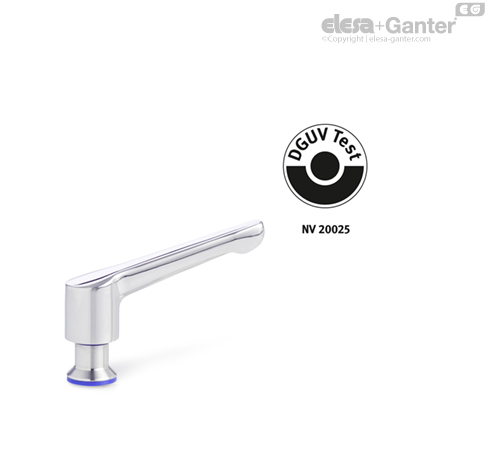 Sert paslanmaz çelik kollu ayarlanabilir el manivelaları GN 305, DGUV Testi ilkelerine uygunlukları sayesinde hijyenik alanlarda kullanım için uygundurlar.