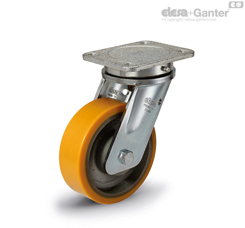 Ağır endüstriyel uygulamalar ile yan darbe ve yüksek hızlar gibi sert kullanım koşulları için uygundur. Dökme kalıplı poliüretan çark, mükemmel yuvarlanma direnci ve esneklik, aşınma ve yırtılmaya karşı yüksek direnç garantiler. Daha fazla bilgi için bkz. RE.F4.