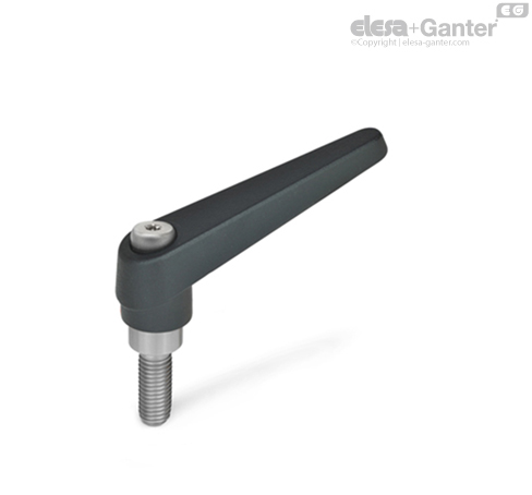 Ayarlanabilir el manivelası GN 101.1, dar bir alanda veya belirli bir kaldırma kolu pozisyonunda kenetlenmesi gereken parçalar için en uygunudur. Merkezdeki ek, kolayca devreden çıkarılabilen dişli kenarlar yoluyla manivelaya bağlanmıştır.