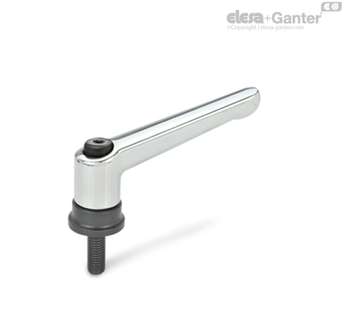 Ayarlanabilir el manivelası GN 300.4, kenetleme kolunun takviyesine bir baskı bilyeli yatağıyla (eksenel bilyeli yatak) bağlanan bir kenetleme alanıyla üretilir.